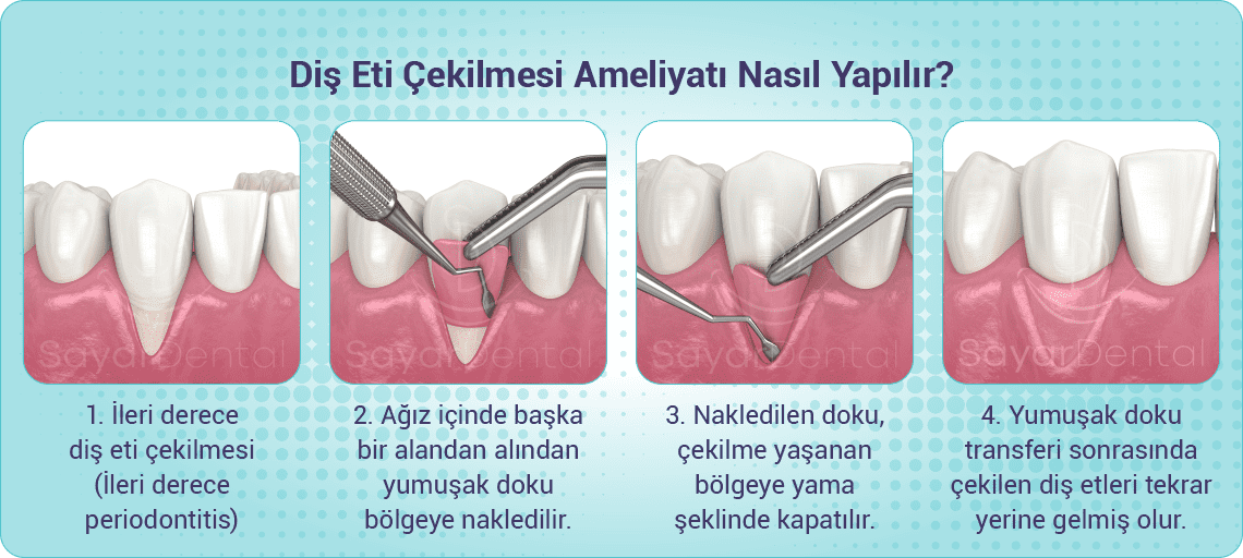 Diş eti çekilmesi tedavisi için öncelikle diş etinde gözlenen iltihabi durumun ortadan kaldırılması gerekir. Bu kapsamda dişin görünen yüzeyine tutunan plaklar diş taşı temizliği uygulamasıyla temizlenir. Diş kökü üzerinde biriken plaklar ise kök yüzeyi düzleştirme ya da flap operasyonu uygulamalarıyla uzaklaştırılır. Ardından kişiye uygun ağız bakım rutini oluşturularak doku iyileşmesinin durumu kontrol edilir. İhtiyaç duyulması durumunda diş eti çekilmesi için ilaç olarak antibiyotik kullanımı planlanarak tedavi desteklenebilir. İltihabi durumun tümüyle ortadan kalktığı tespit edildiğinde diş eti çekilmesi belirtilerinin tedavi sürecine geçiş yapılabilir. Bu kapsamda bölgedeki dokunun desteklenmesi ve güçlendirilmesi amacıyla probleme uygun olarak tedaviler planlanabilir. Ameliyat olarak da nitelendirebileceğimiz bu tedaviler, serbest diş eti grefti ya da bağ dokusu grefti’dir.