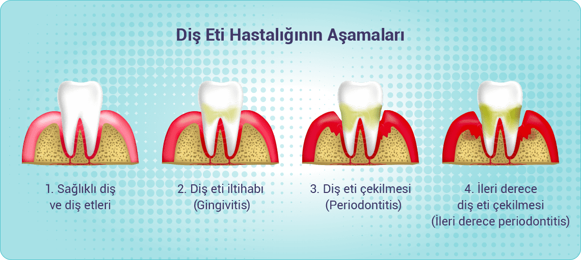Periodontal dokularda iltihap gelişimini takip eden ile süreçte diş etinde şişlik, kızarma, diş fırçalarken diş eti kanaması ve ağız kokusu ilk ortaya çıkan belirtiler olarak sıralanabilir. Diş etinde şişlik ve iltihap gelişiminin ilerleyen dönemlerinde ise durduk yere diş eti kanaması ve diş eti çekilmesi belirtileri kendini gösterebilir. Bu belirtiler; diş boyunun uzaması ve ağız kapanış ilişkilerinin değişmesi olarak gözükebilir. Bunların dışında dişlerin sallanması ya da yer değiştirmesi de diş eti hastalıkları belirtileri olarak sıralanabilir.
