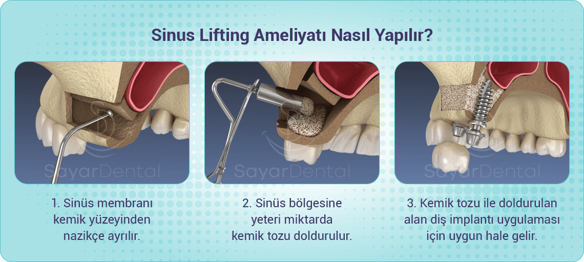 Sinus lifting, üst çene arka bölgede diş implantı tedavisine ihtiyaç duyan kişiler için uygundur. İmplant diş uygulaması için yeterli kemik yüksekliğinin mevcut olmaması durumunda sinüs kaldırma ameliyatı uygulanabilir. Bu uygulamayla birlikte kemik dokusu, gelecekte uygulanacak implantın stabilizasyonunu sağlamak için uygun hale getirilebilir. İmplant diş ve sinüs yükseltme operasyonları koşulların uygun olduğu durumlarda aynı seans içerisinde de uygulanabilir. İmplantlar hakkında daha fazla bilgi almak için implant diş sayfamızı ziyaret edebilirsiniz.